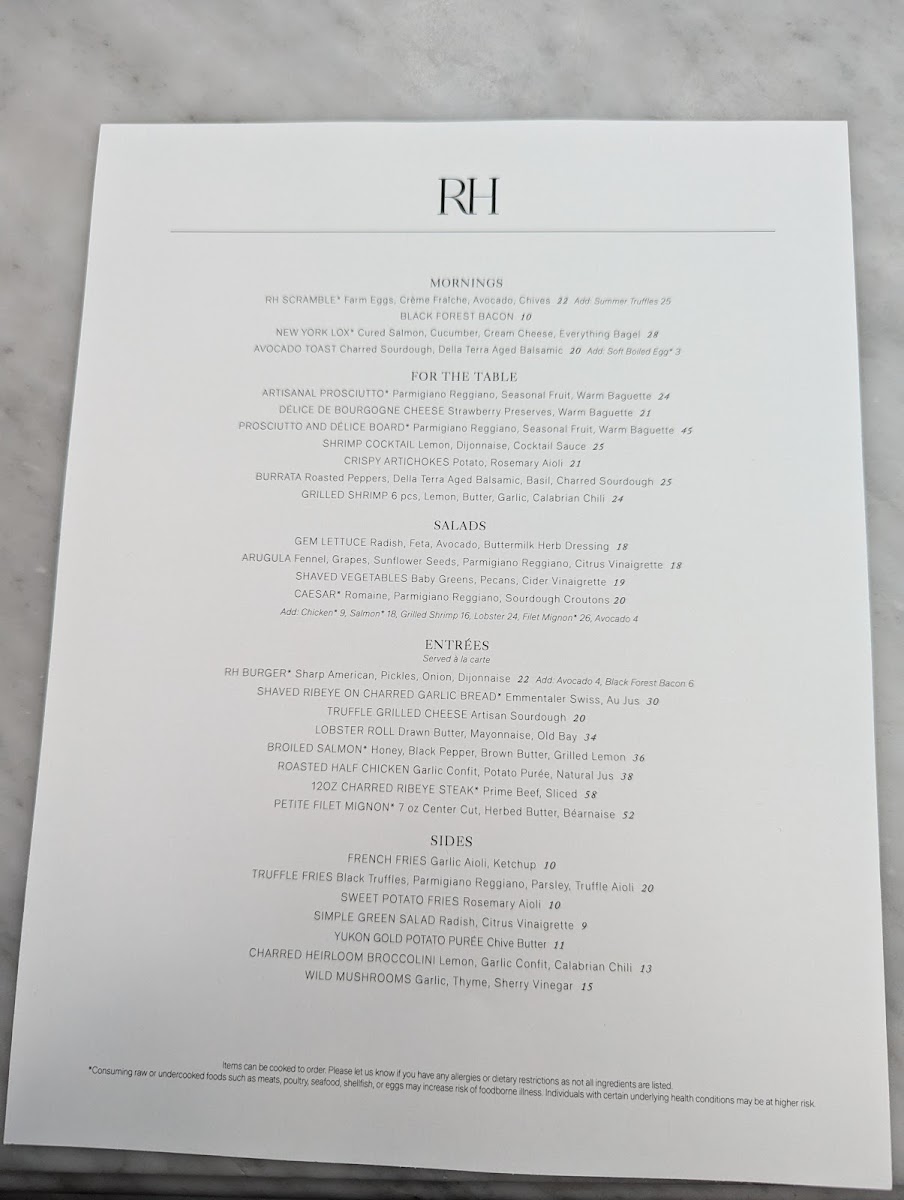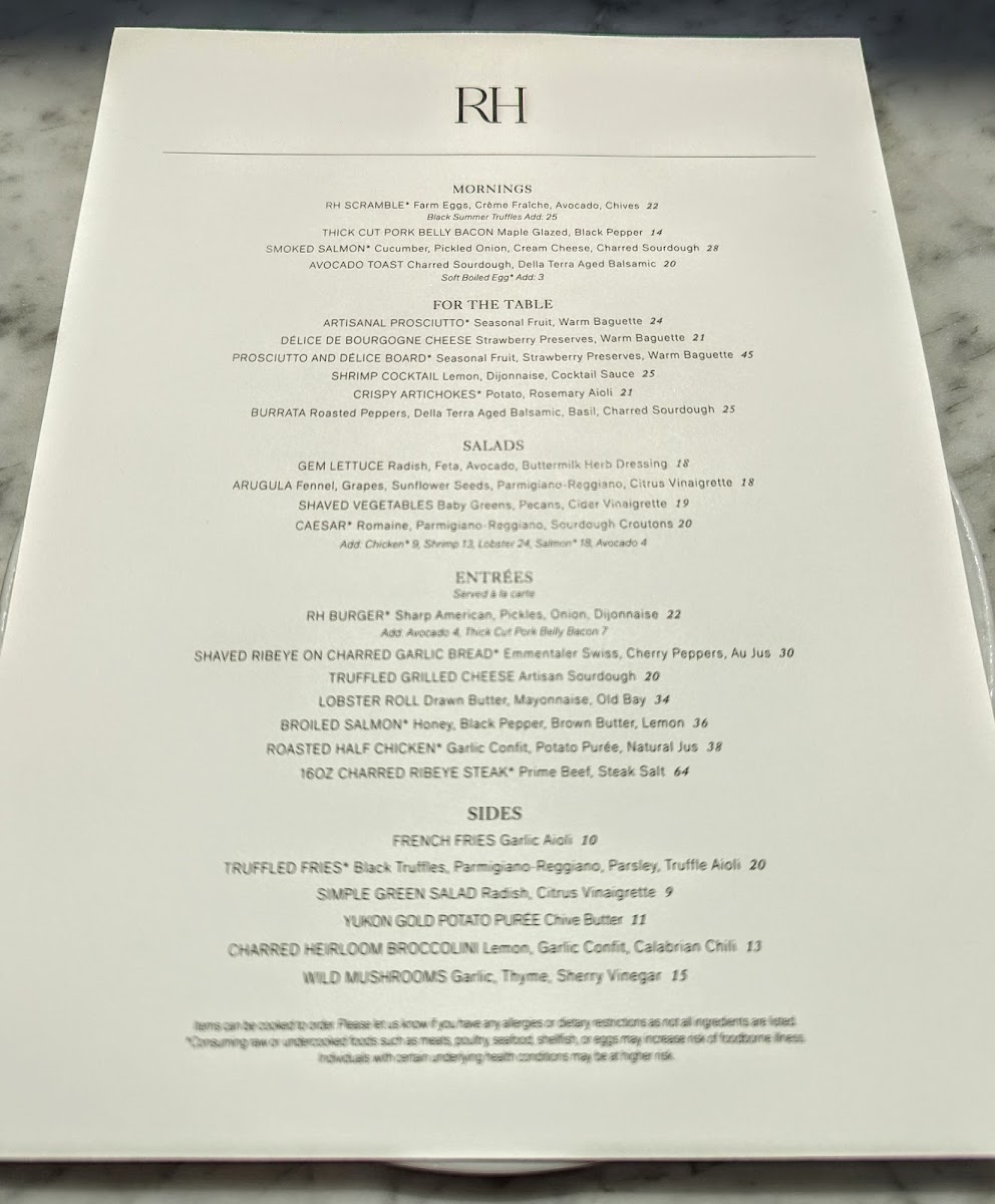 The mouthwatering selections include the Lobster Roll, delicately complemented by drawn butter and Old Bay, and the Broiled Salmon that boasts honey and black pepper flavors. For hearty choices, don’t miss the Roasted Half Chicken or the signature RH Burger, both made with quality ingredients that shine.